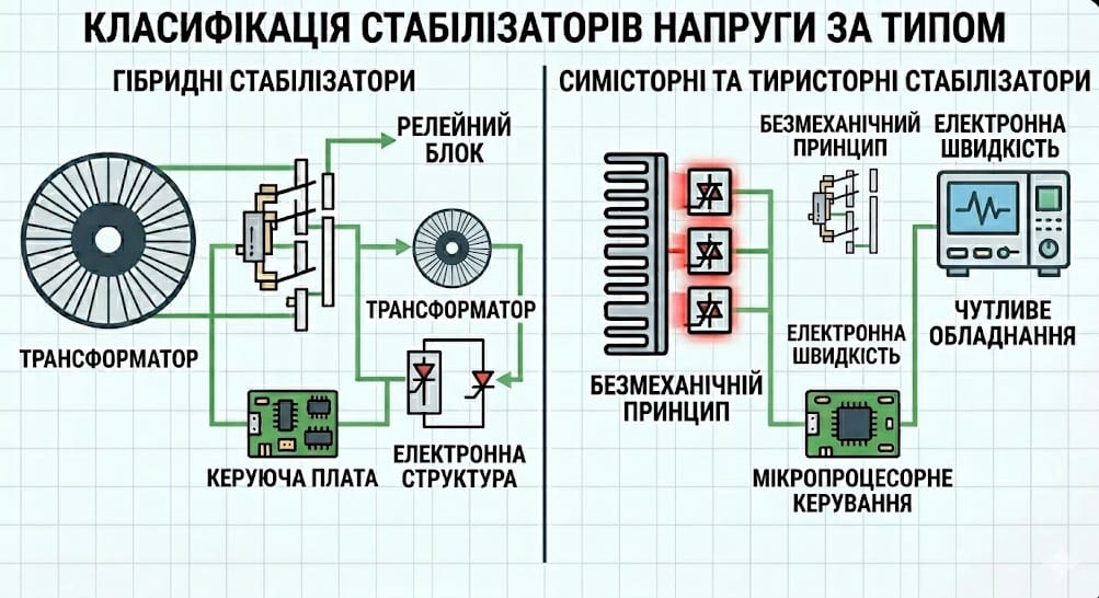 Гібридні моделі поєднують кілька способів стабілізації і підходять для мереж із різкими і частими перепадами. Симісторні та тиристорні стабілізатори працюють повністю в електронному режимі відзначаються високою швидкістю реакції та відсутністю механічного зносу що важливо при інтенсивній експлуатації.