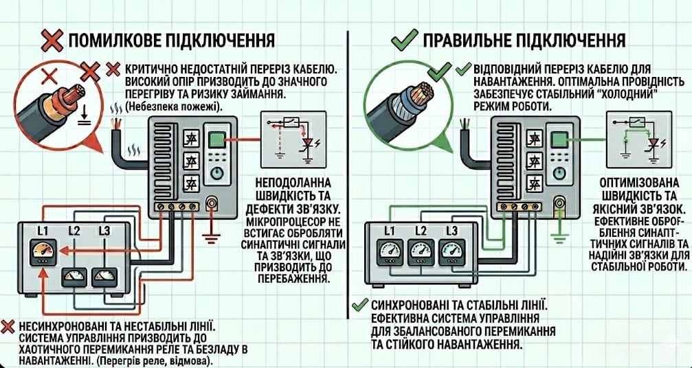 Найчастіша помилка це недостатня підготовка. До неї належить використання кабелю з перерізом який не відповідає навантаженню що призводить до перегріву і зниження ефективності стабілізатора. Також відсутність заземлення або його неправильне виконання що впливає на роботу захисних елементів пристрою. Іноді стабілізатор підключають до розподільчої коробки без урахування реального розподілу фаз і це призводить до дисбалансу навантаження та високого навантаження на одну з фаз. Усі ці помилки легко уникнути якщо детально опрацювати схему підключення і співставити її з характеристиками мережі та обладнання або звернутися до спеціаліста.