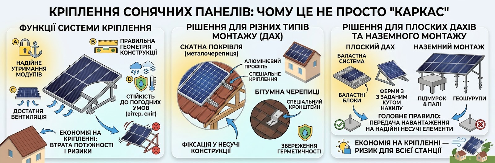 Головне правило — кріплення повинно передавати навантаження на надійні несучі елементи. Якщо конструкція закріплена формально або без урахування реальної міцності основи, з часом можливі деформації, вібрації, пошкодження покрівлі або навіть зрив модулів під час сильного вітру.
