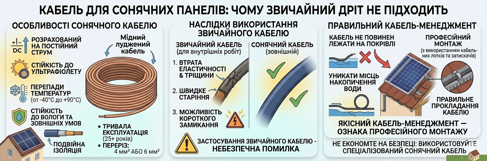 Одна з типових помилок — використання звичайного кабелю, який не призначений для зовнішніх умов та постійної дії сонця. Такий кабель швидше старіє, втрачає еластичність, тріскається і може стати джерелом небезпечних ситуацій.