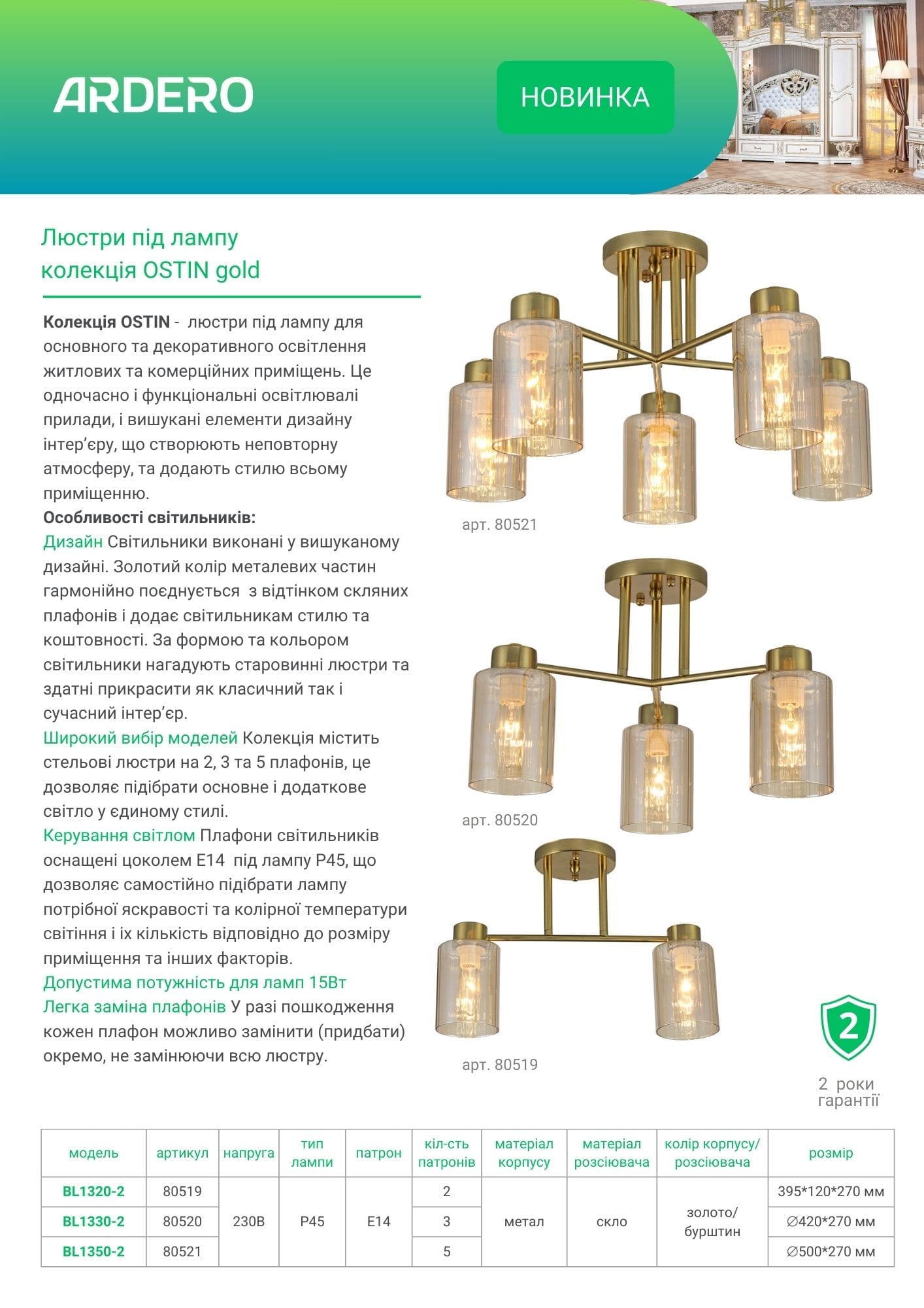 Дизайн Светильники выполнены в изысканном дизайне. Золотой цвет металлических частей гармонично сочетается с оттенком стеклянных плафонов и придает светильникам стиль и драгоценность. По форме и цвету светильники напоминают старинные люстры и способны украсить как классический, так и современный интерьер.