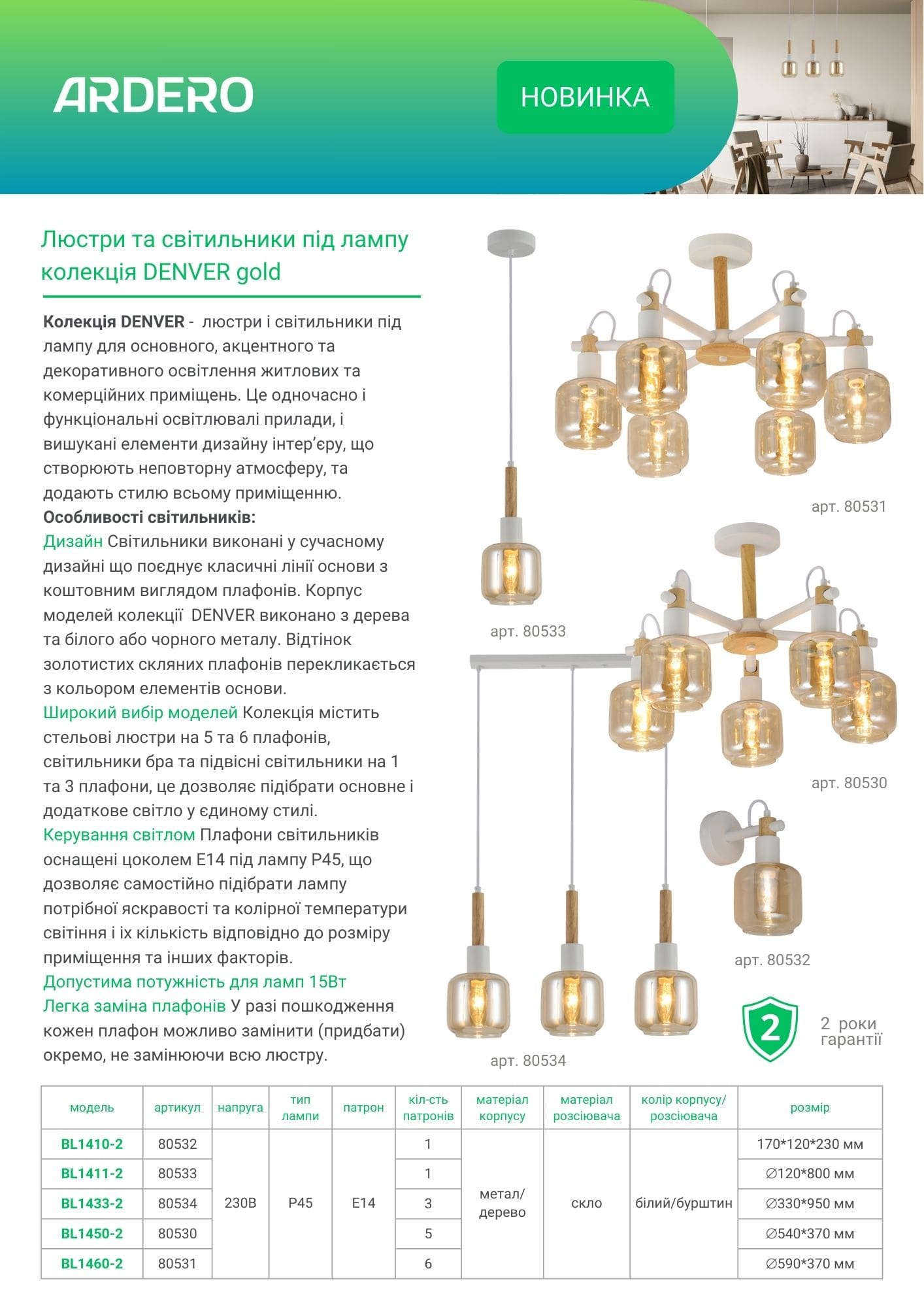 Дизайн Светильники выполнены в современном дизайне, сочетающем классические линии основы с ценным видом плафонов. Корпус моделей коллекции Denver выполнен из дерева и белого или черного металла. Оттенок золотистых стеклянных плафонов перекликается с цветом элементов основания.