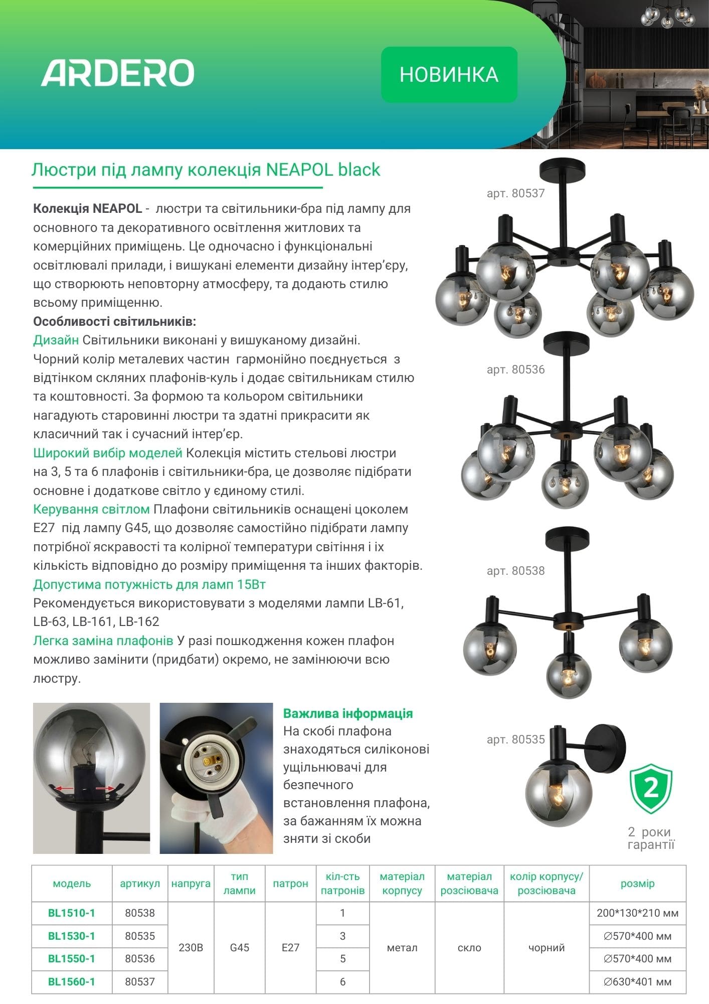 Дизайн Светильники выполнены в изысканном дизайне. Черный цвет металлических частей гармонично сочетается с оттенком стеклянных плафонов-шаров и добавляет светильникам стиля и драгоценности. По форме и цвету светильники напоминают старинные люстры и способны украсить как классический, так и современный интерьер.