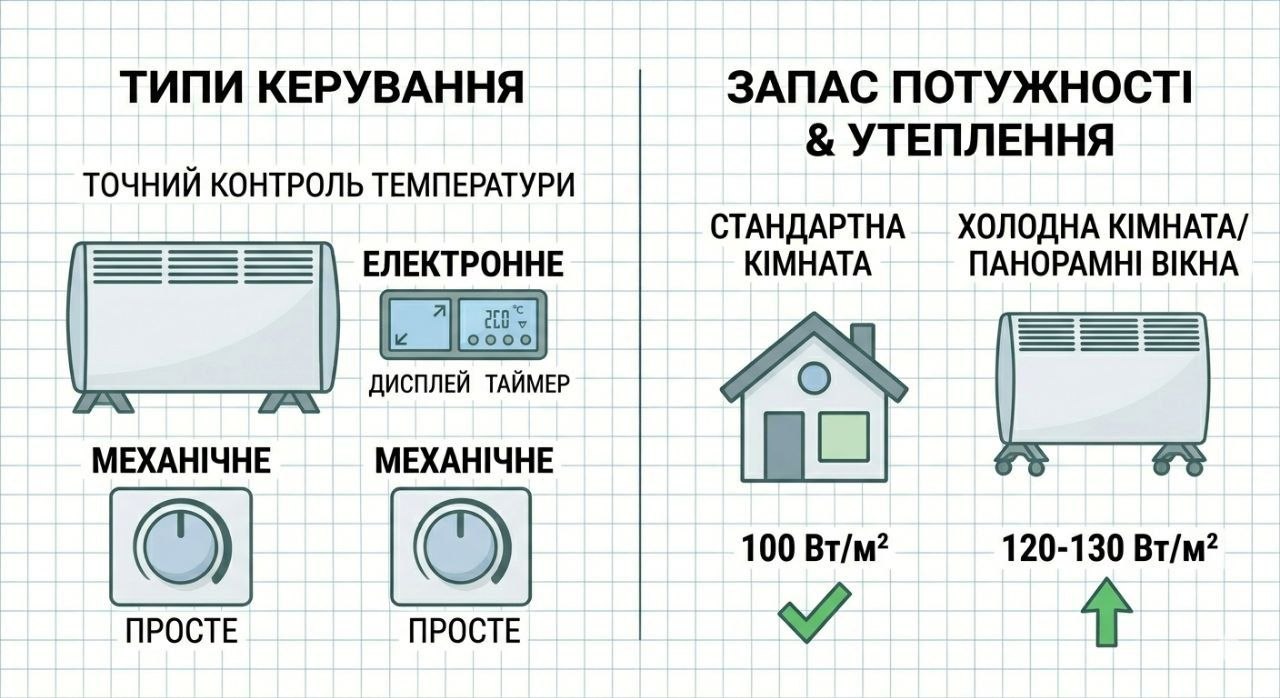 Если это спальня, где вы ночью предпочитаете комфортную температуру, можно выбрать мощность чуть выше основанной, но с термостатом и электронным контролем. Для коридора или санузла достаточно варианта попроще.